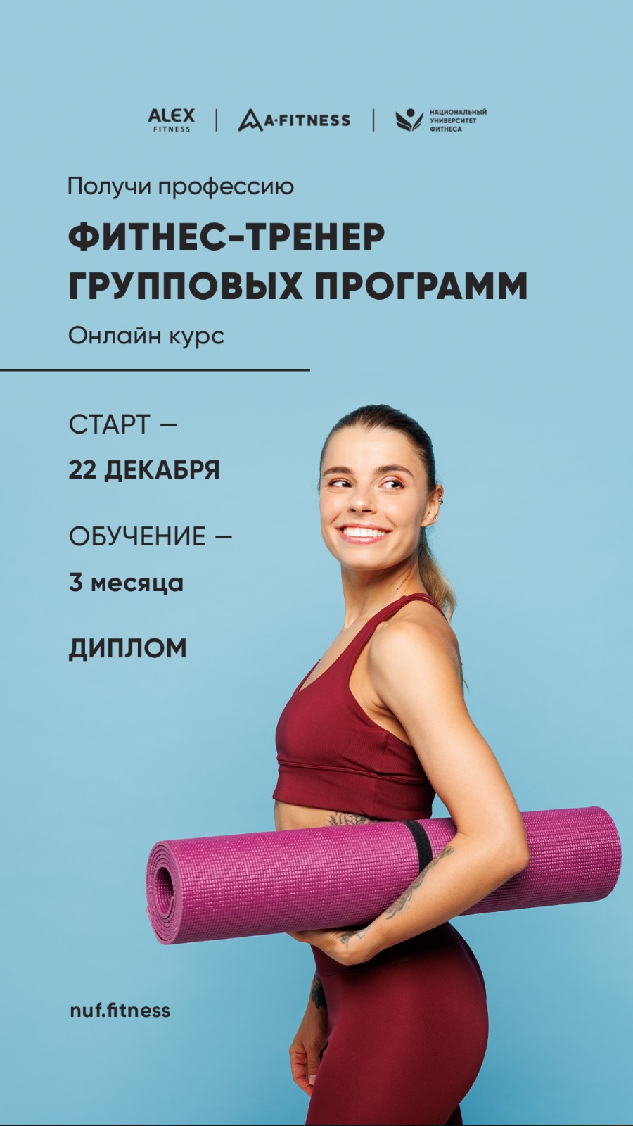 Вы получите все необходимые знания и навыки для начала карьеры в фитнес-клубе сразу после окончания обучения.